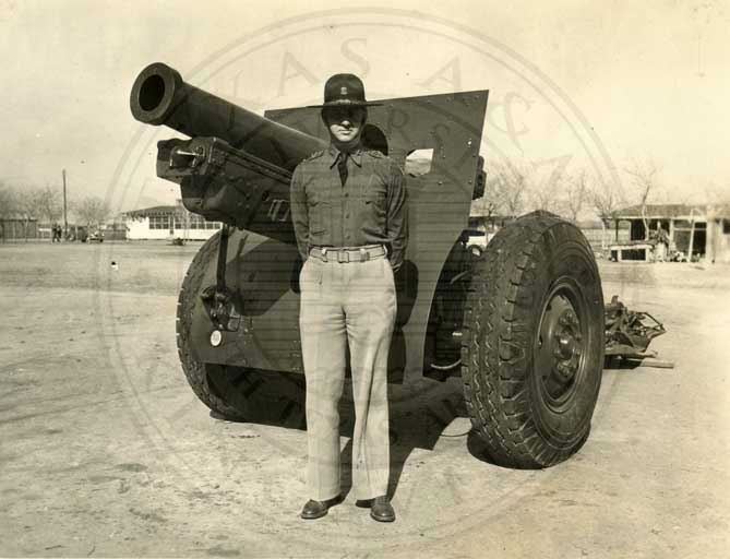 Lt. Ben F. Wilson, Jr. with one of Battery F. Guns. Taken on site of former race track about where Steinke Gym now located. Buildings in background used as Battery headquarters. After war started converted to nursery school. 1941. |