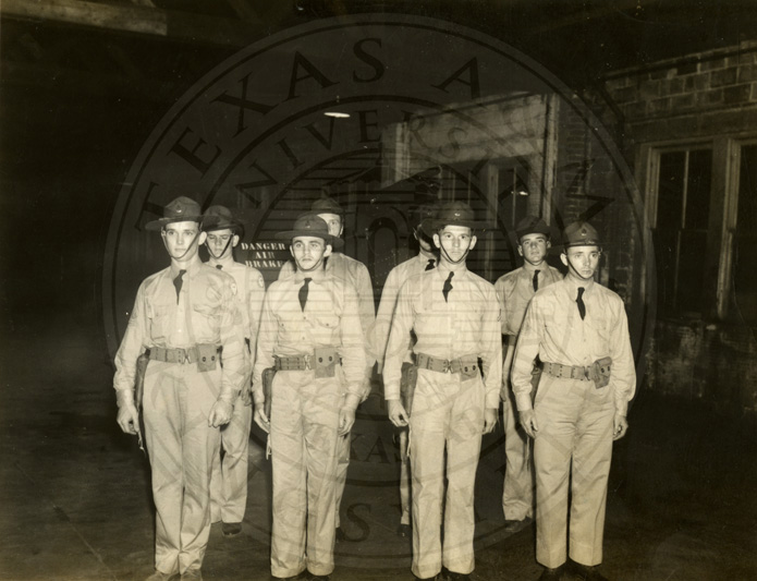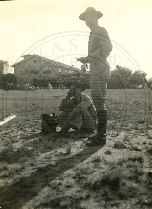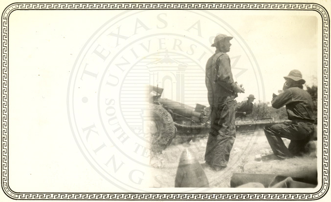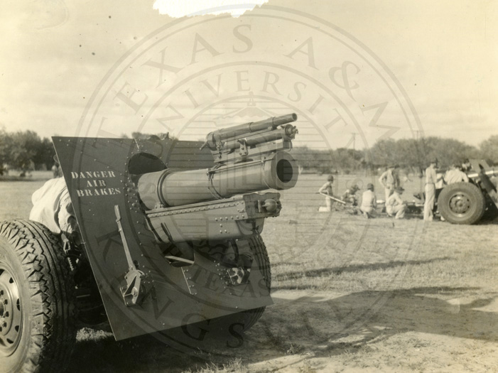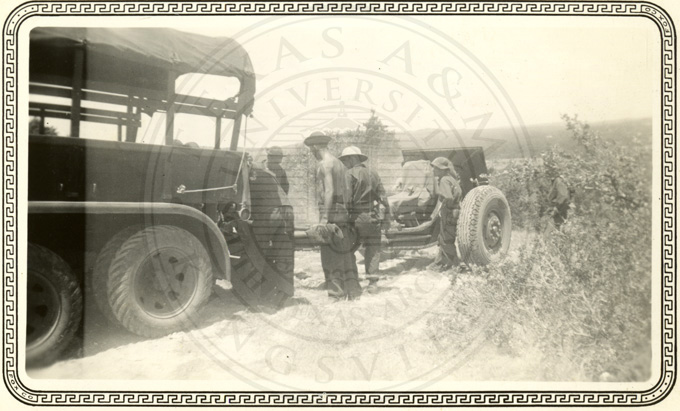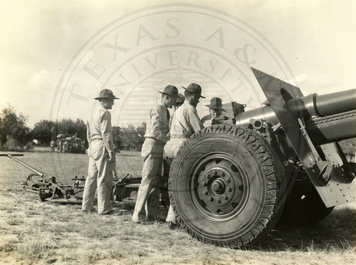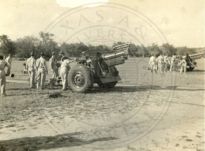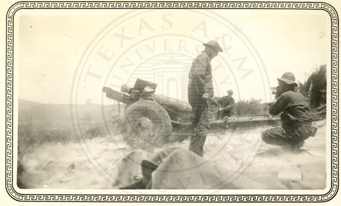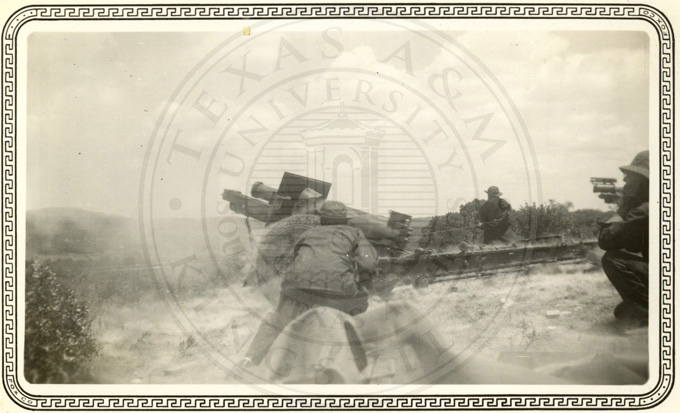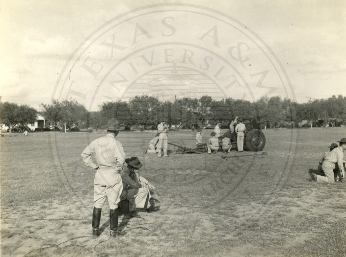 Gunnery practice on A&I campus to the east of Old Administration bldg. Ben Wilson standing and supervising.