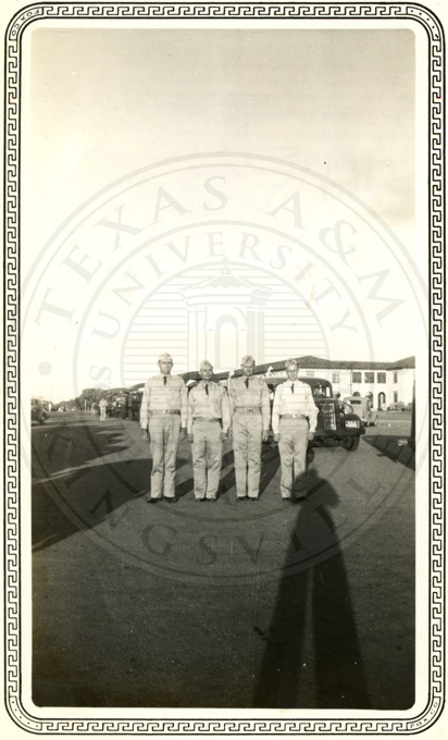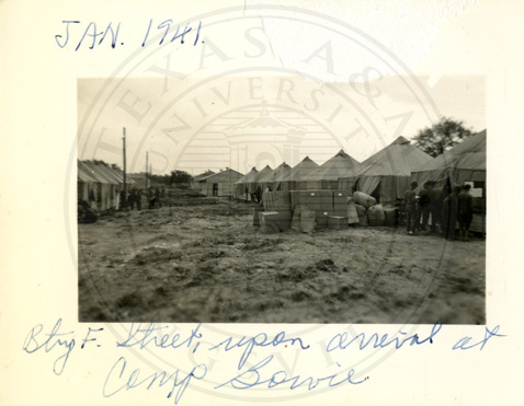 Summer field training. Capt. Smith, Lts. Bailey, Hall and Wilson standing in front of tents. |