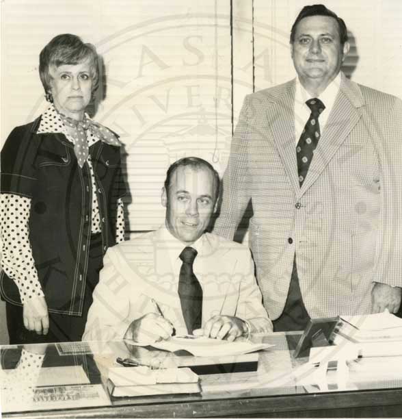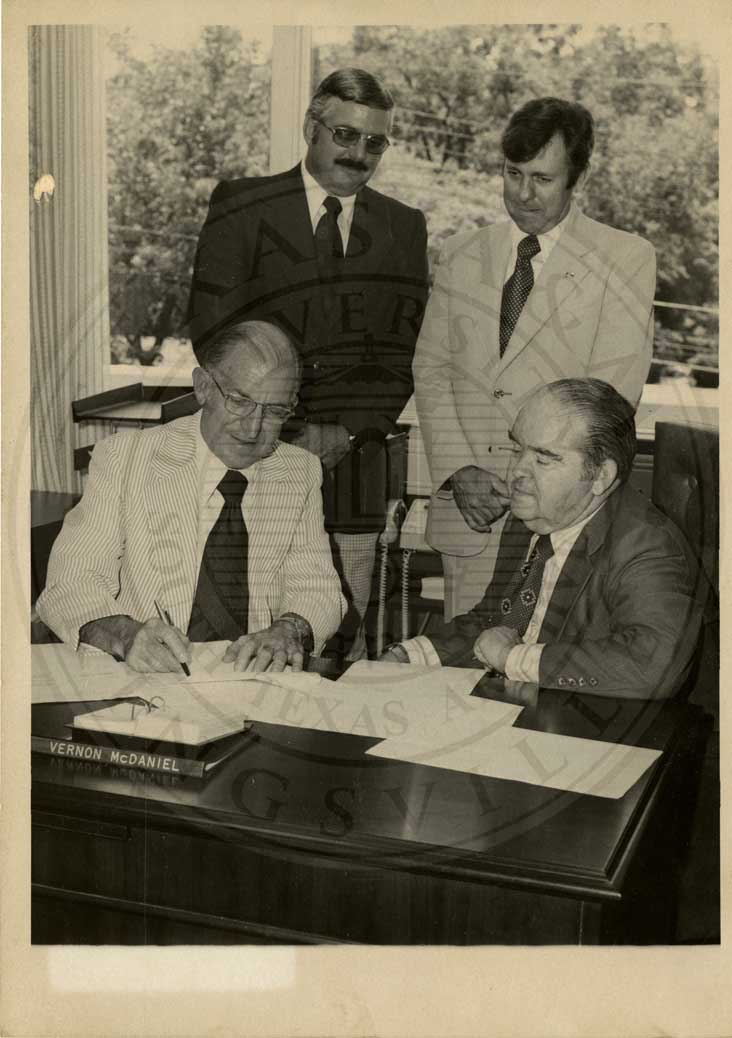 Members of the Bishop (TX) Chamber of Commerce witnessing the signing of an unidentified document. Front (L-R): Vernon McDaniel; unidentified man. Back (L-R): unidentified man; unidentified man. |