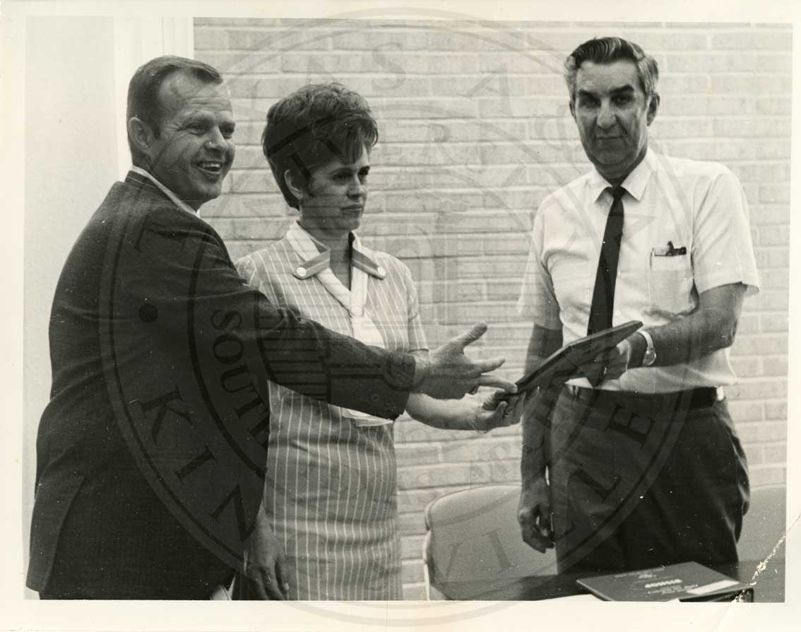 Bishop (TX) Chamber of Commerce. (L-R): Reba Staff, secretary; unidentified man; unidentified man.
