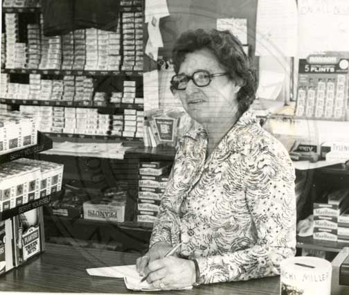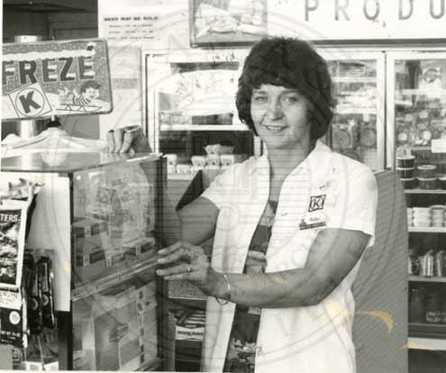 Unidentified woman behind a check-out register, and counter stocked with cigarettes and candy. Possibly a Circle K convenience store. |