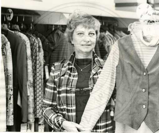 Unidentified woman standing next to racks in a clothing store. |