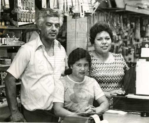 Unidentified family of three standing behind the register of an unidentified business. |