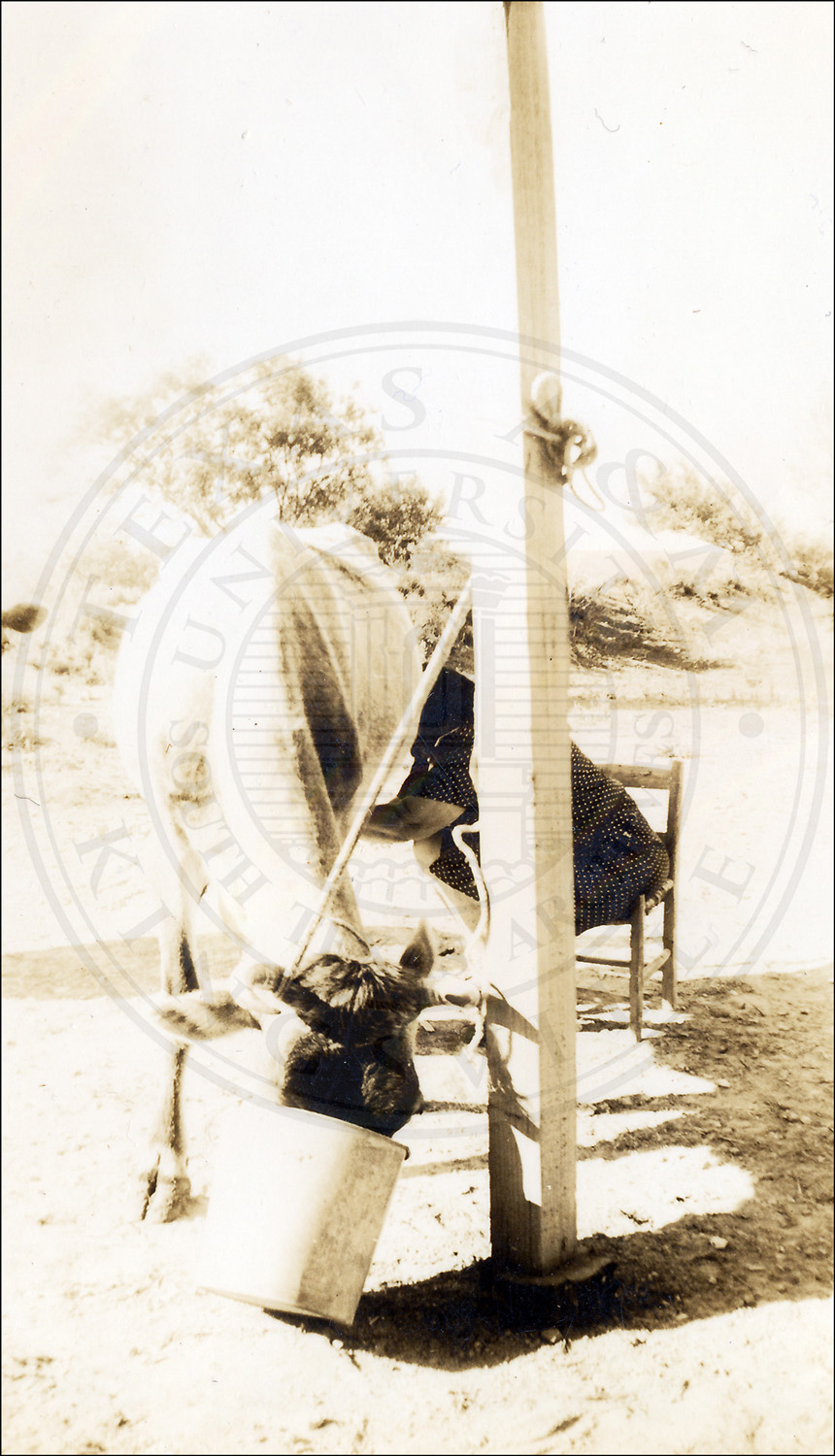 An unidentified woman milking a cow at the Wolf Ranch, near Laredo, in Webb County, Texas.