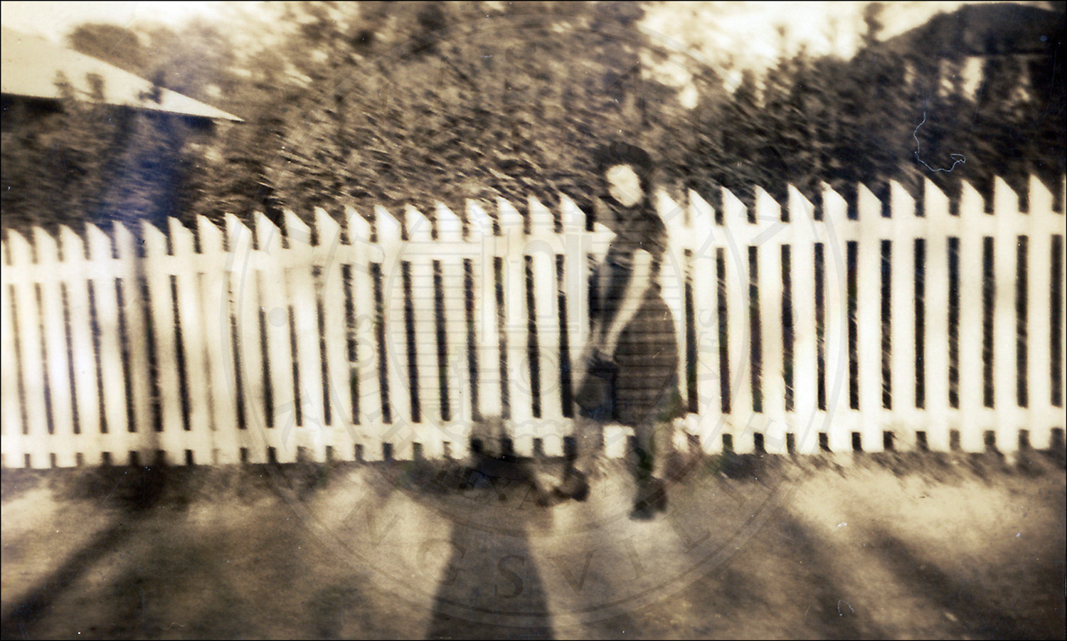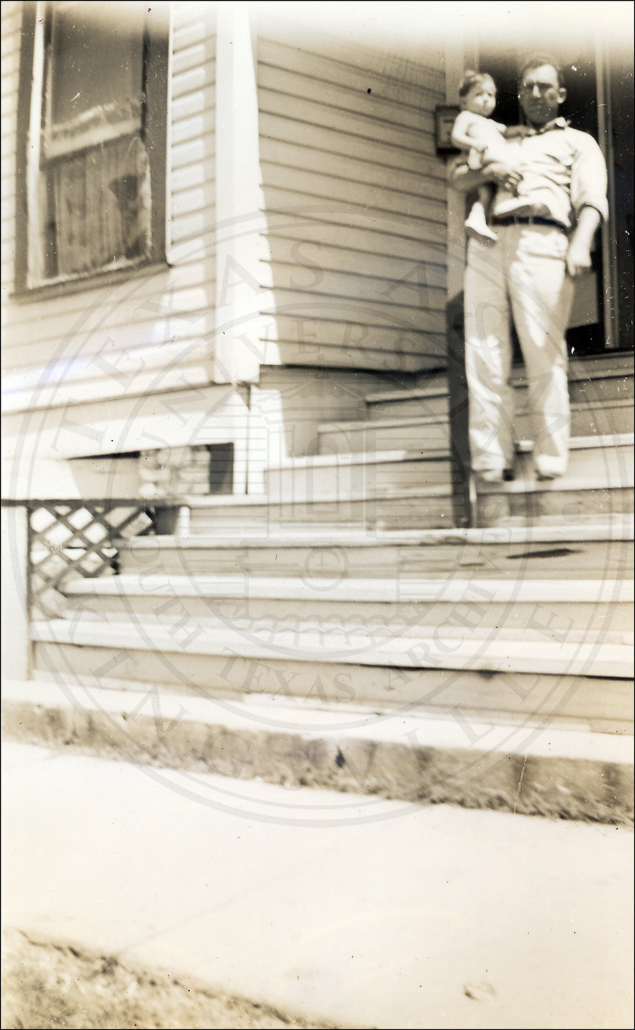 Unidentified relative of Bruno Wolf Jr. holding a child in front of a house. Caption on back: "A.L. + A.L. Jr."