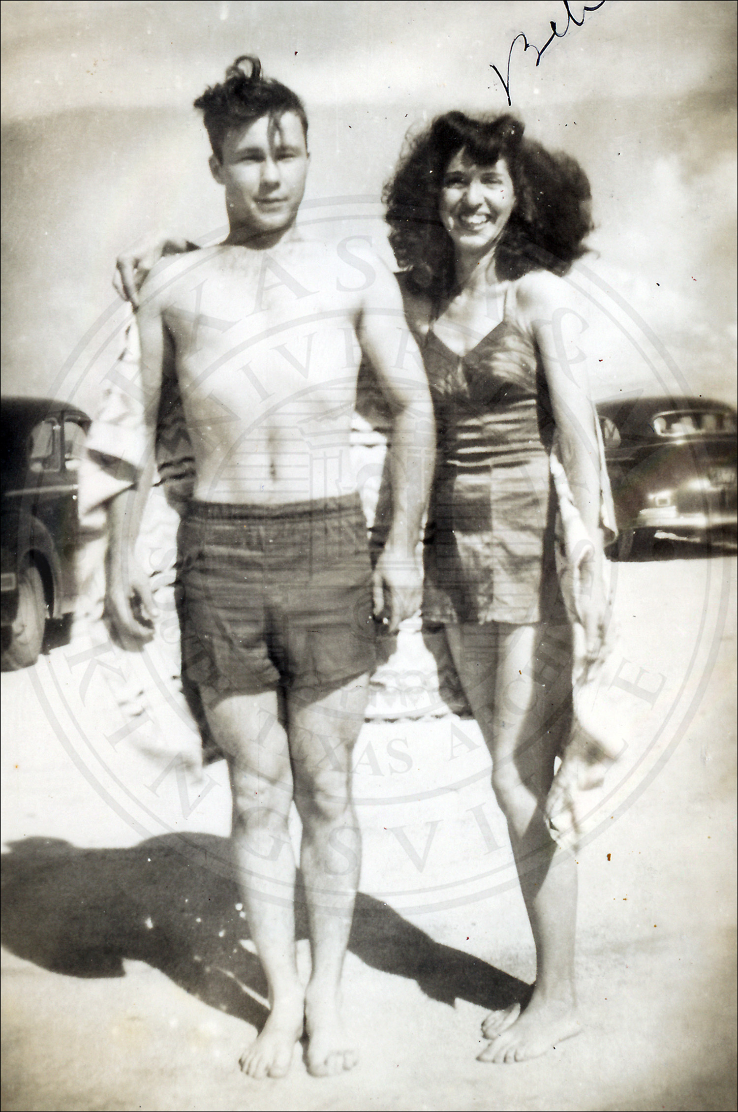 Bebe Garcia (left); unidentified woman (center); and Bruno Wolf Jr. (right) at North Beach, Corpus Christi, Nueces County, Texas.