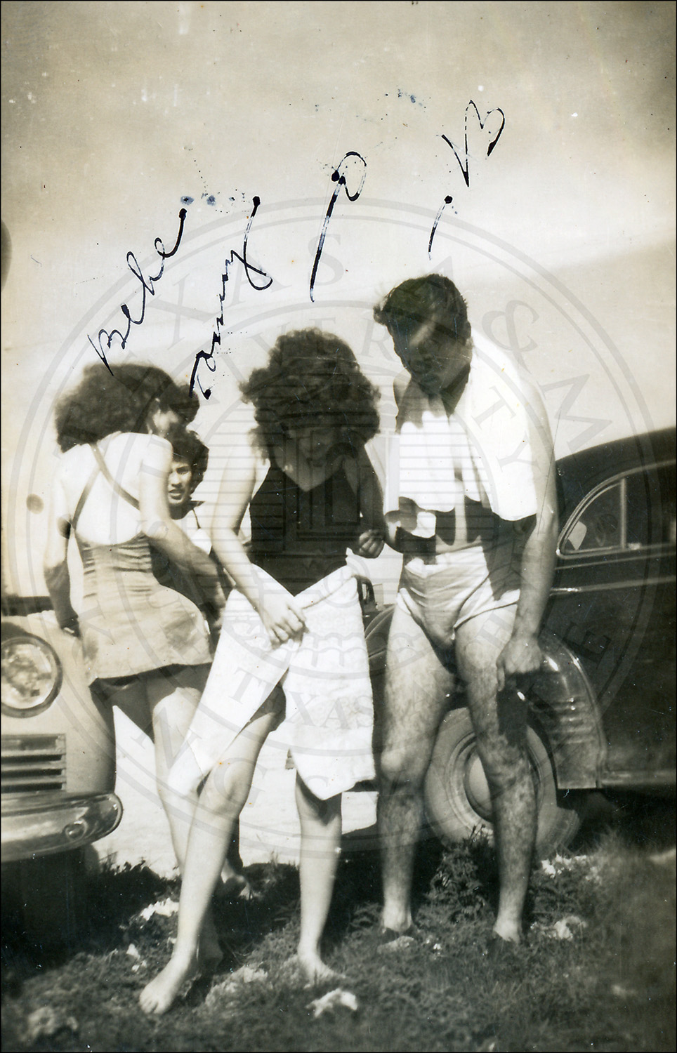 Bebe Garcia (left); two unidentified women (center); and Bruno Wolf Jr. (right) at North Beach, Corpus Christi, Nueces County, Texas.
