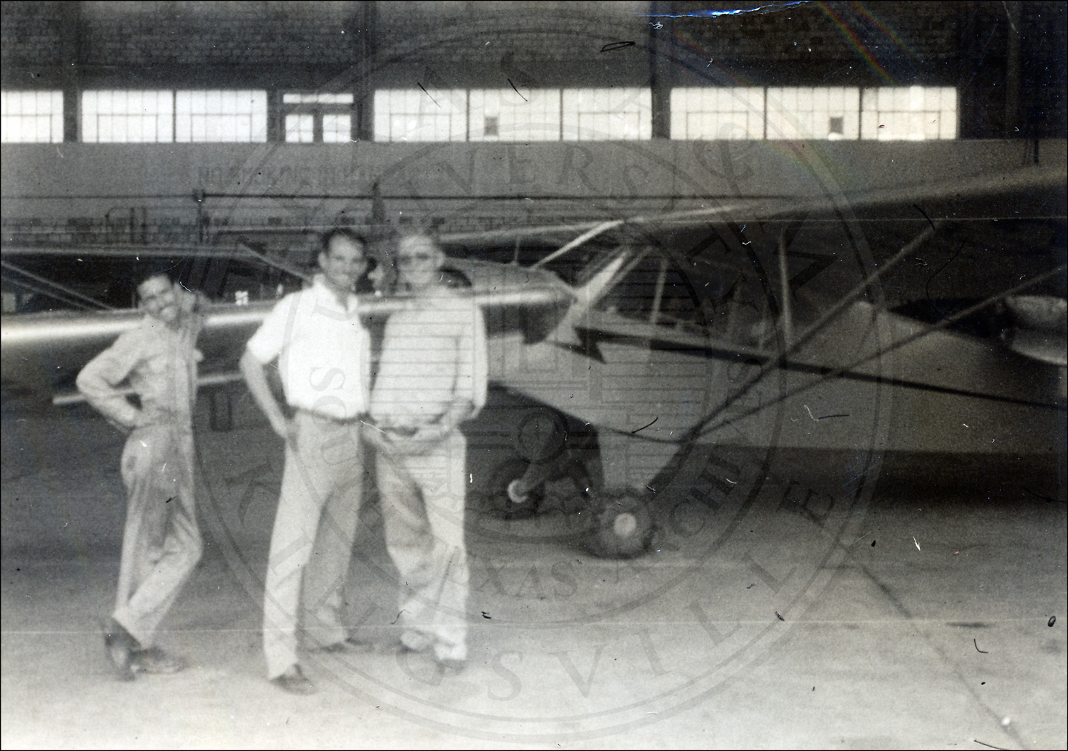 Three unidentified men posing in front of aircraft in an airfield hangar. Laredo, Texas.