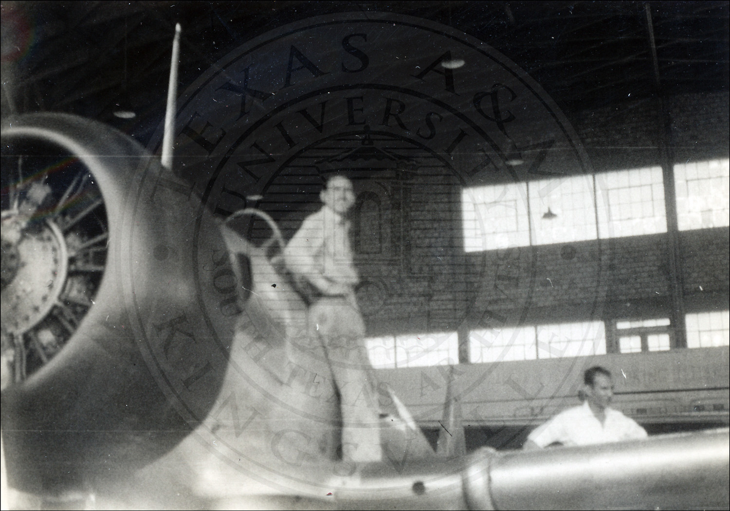 Two unidentified men posing next to an aircraft in an airfield hangar. Laredo, Texas.