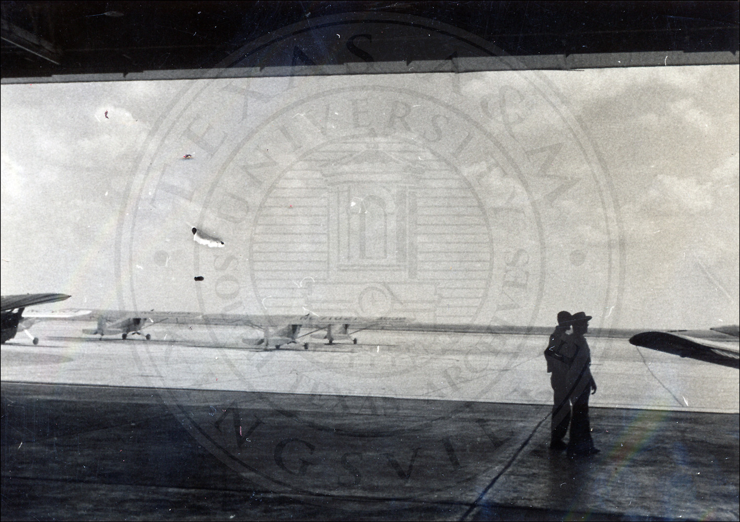 Scene from inside an airfield hangar of supplies being air-dropped to the airfield, while two unidentified men look over aircraft in the hangar. Laredo, Texas.