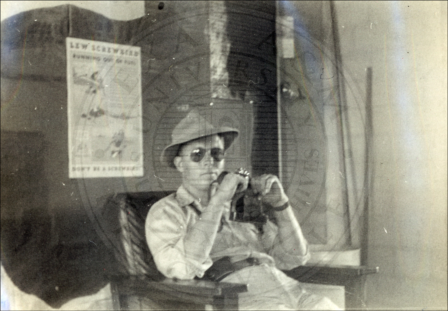 The photographer (unidentified) sitting inside an airfield hangar. Laredo, Texas.