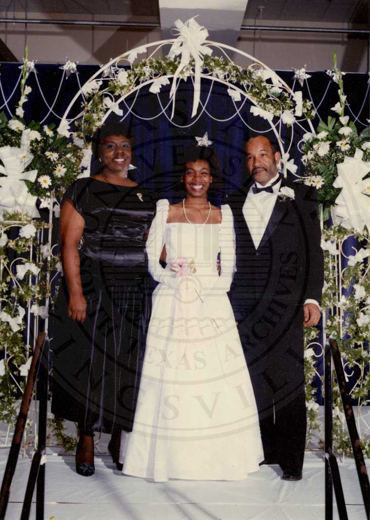 Debutante Ceremony in early 1980s. L>R Sandra Jefferson, Security Chief of Texas A&I University; Alvinette Jefferson; and James A. Jefferson. |