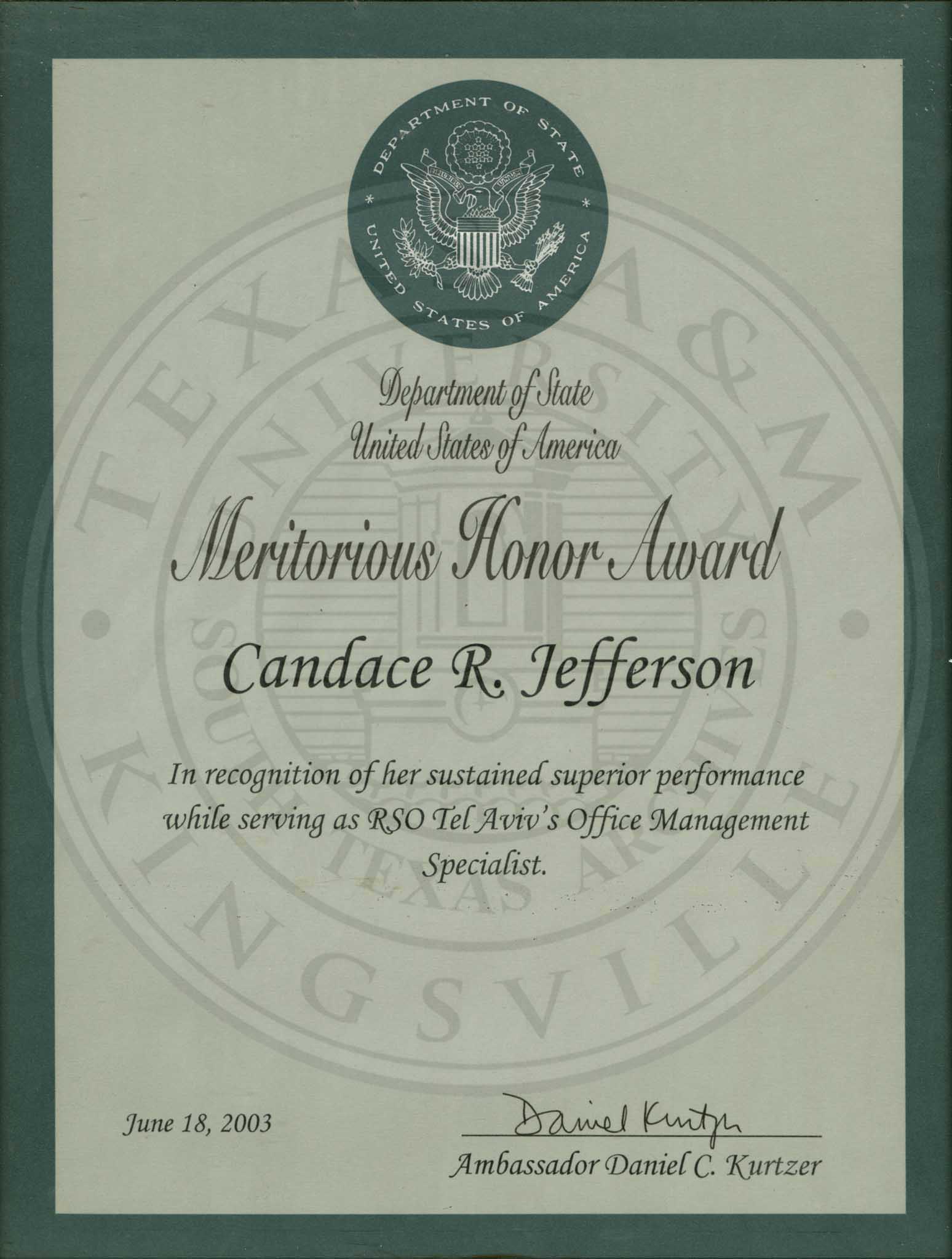 Candace Jefferson worked for the U. S. State Department at the U. S. Embassy in Tel Aviv. On June 18, 2003 she was awarded the Meritorious Honor Award in recognition of her sustained superior performance while serving as RSO Tel Aviv's Office Management Specialist. |