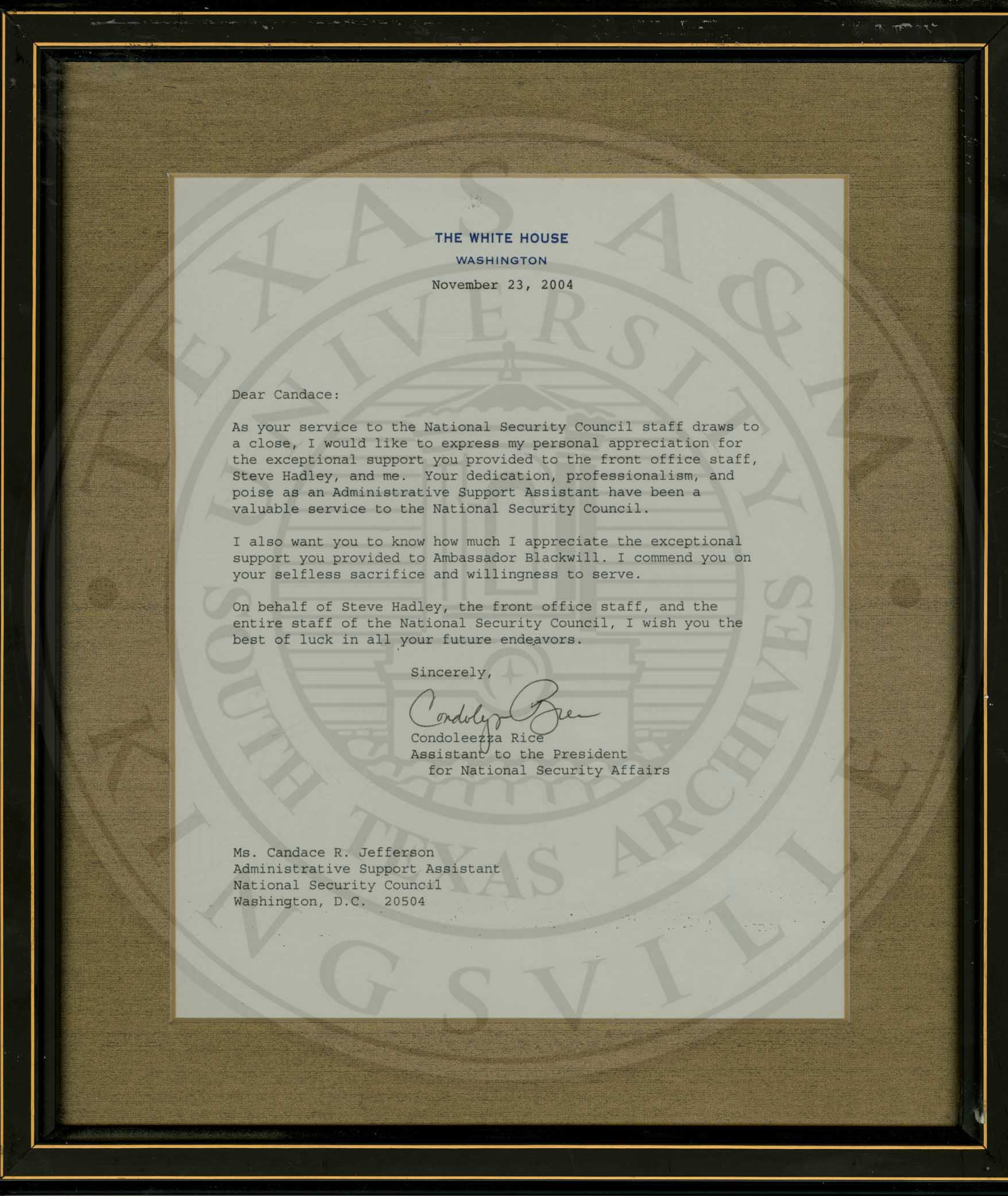 Farewell letter from Condoleezza Rice to Candace Jefferson thanking her for her service. |