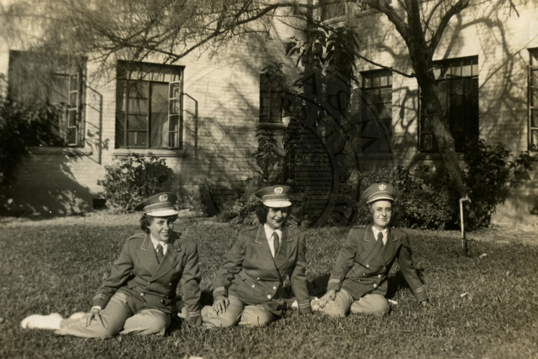 Photo of B.J., Dorine and Carolyn taken outside of dorm building