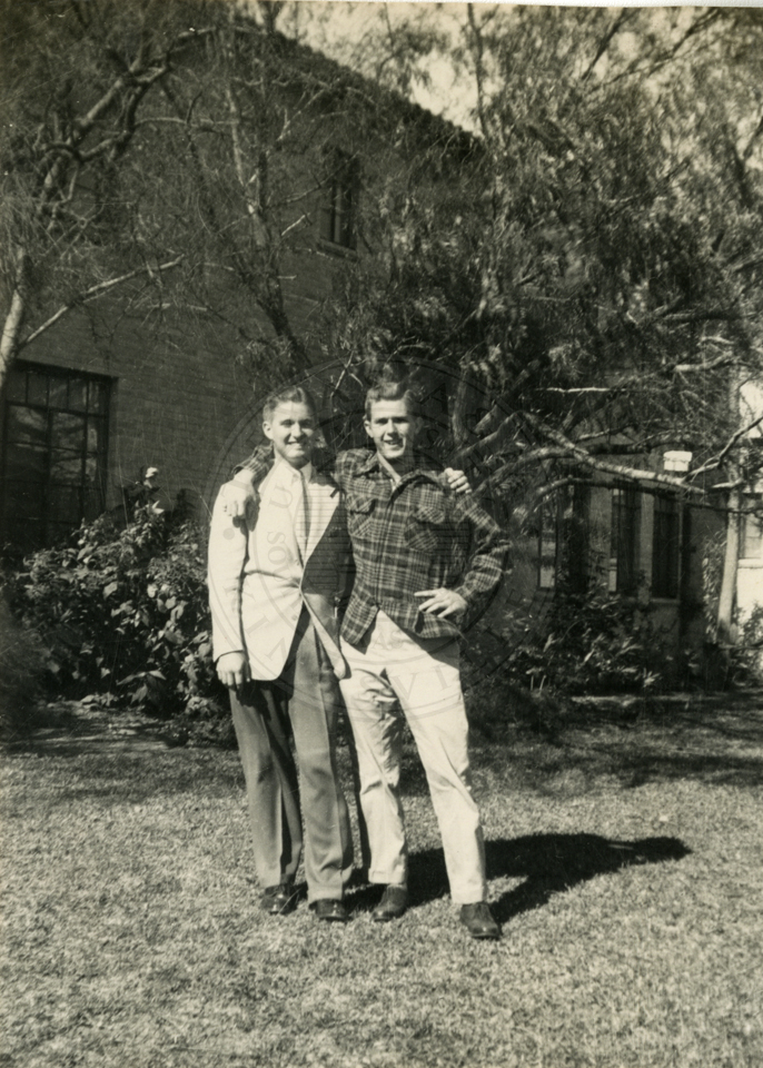 Photo of Vernon and Dennis standing in front of building and tree