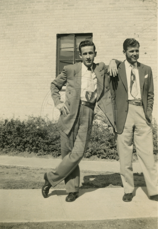 Photo of Wally and Ralph in suits posing in front of building