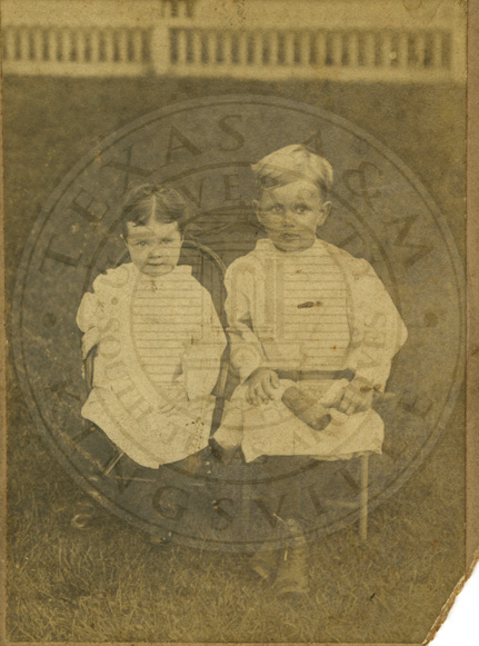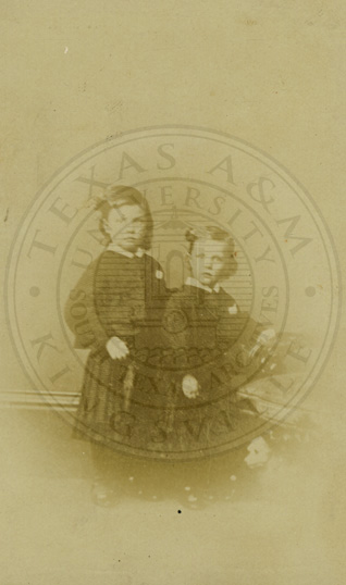 Two children sitting in yard. Inscribed: Rumey Nicole and William Duncan. Bloomington, Ill. USA. B/w. 4.25 x 6 inches. Cabinet photo. Albumin print