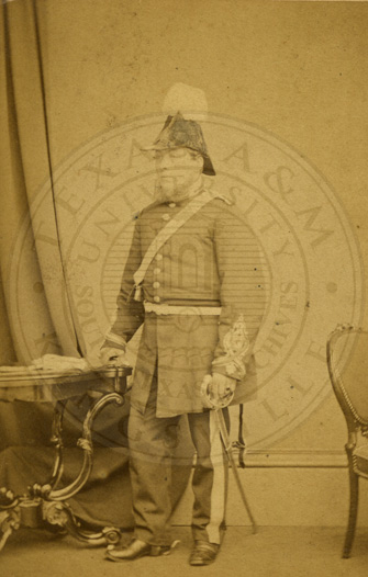 19th century male member of More family in Scotland. Man standing by table in full dress uniform. b/w. 2.5 x 4 inches. Stuart Photographer. 120 Buchanan Street, Glasgow & Thistlebank, Charlotte St. Helensburg. Carte de visite fading, Albumin print