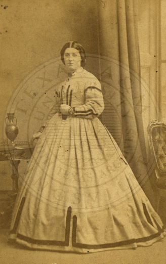 19th century female member of More family in Scotland. Woman standing by table with chair in background. b/w. 2.5 x 4 inches. Stuart Photographer. 120 Buchanan Street, Glasgow & Thistlebank, Charlotte St. Helensburg. Carte de visite fading. Albumin print |