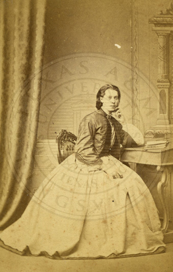 19th century female member of More family in Scotland. Woman seated at writing table. b/w. 2.5 x 4 inches. J. & G.Turner photographer. 11 West Nile Street, Glasgow. Carte de visite fading. Albumin print