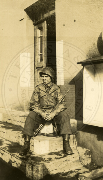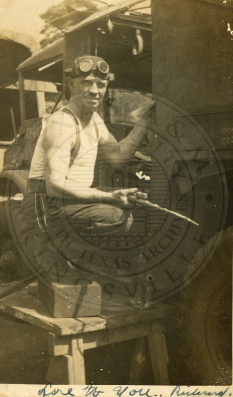 Richard More working on airplane. Note says:”This is the last job I worked on in concluding army. One of our gun tractors. Dick sent this to me. But, I’ll get another one finished. I’d like for you to keep this from him. Love Peggy.” B/w. 3.25 x 5.5 inches |