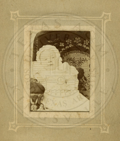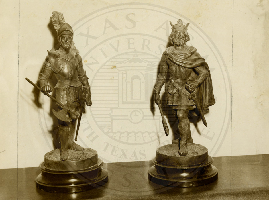 Photo of two statues on display after Roderick More family receives family heirlooms while living in Corpus Christi. Ca1947. b/w. 5 x 7 inches.