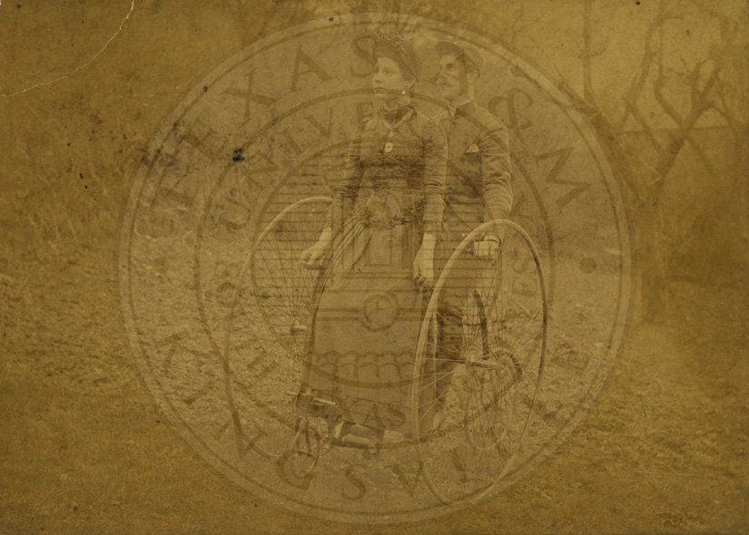 19th century man and woman on cycle in wooded area. Cycle has two very large back wheels, one smaller one in front and one middle sized wheel on the back. The Couple is standing on the cycle, holding on to bars on the inside of the wheels. Inscribed: “For Daivd More. 1888.” B/w. 4 x 6.5 inches. Cabinet photo. Albumin print |