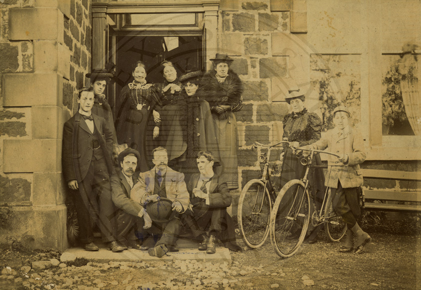 More family in front of their home in Scotland. b/w. 4 x 6.5 inches. Cabinet photo. Gelatin and collodion printing out paper.