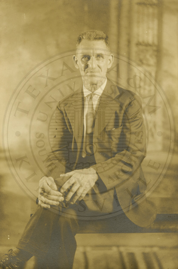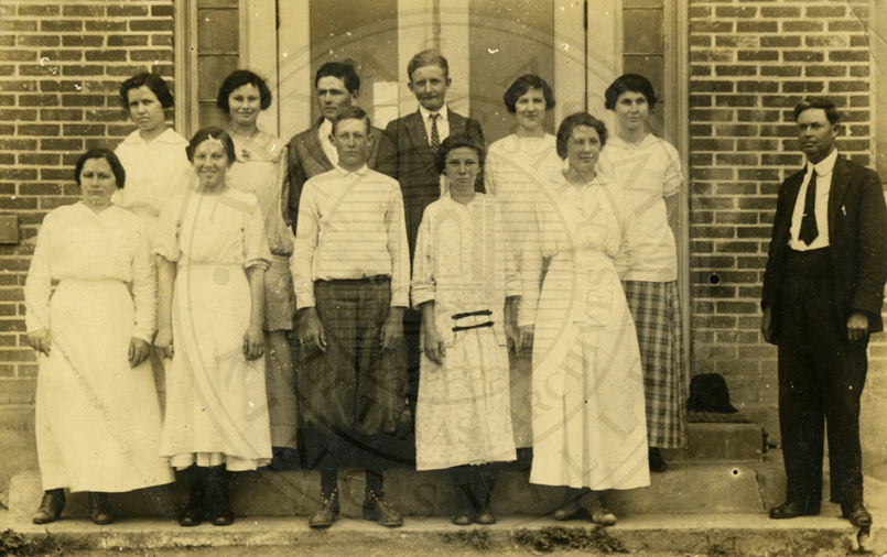 Students and teacher standing in front of school. Believed to be Rodrick More in Kingsivlle, TX. B/w. 3.25 x 5.5 inches
