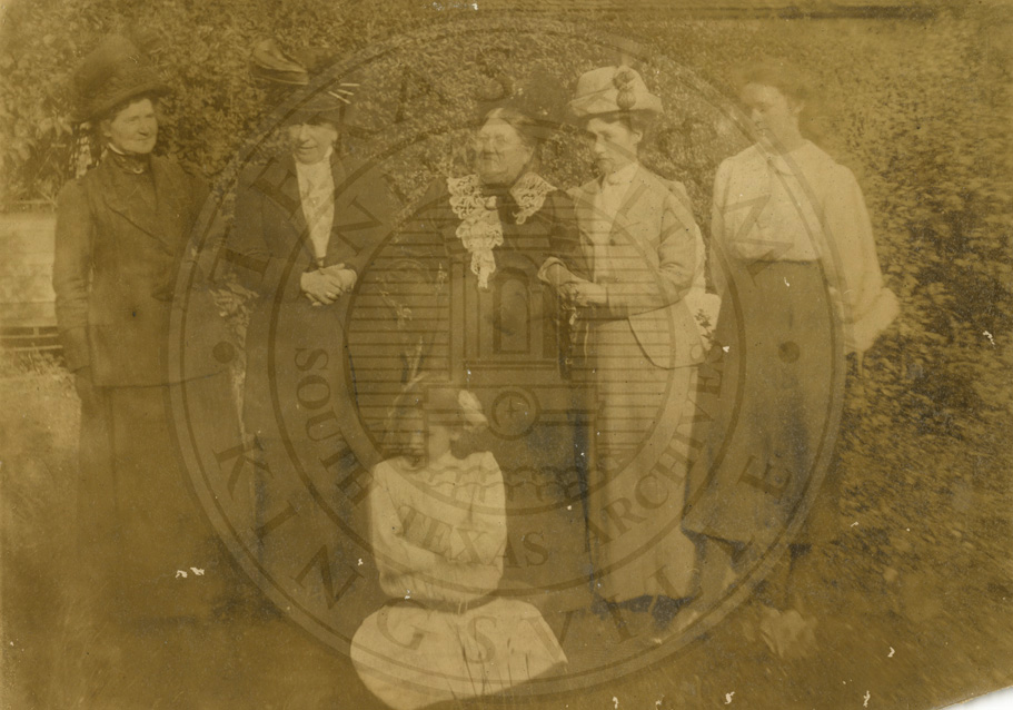 Same lady from #24 is standing in middle of photo. Inscribed: “A group myself in the middle. Miss Fullerton with her arm in mine and her neice next [to] her and two other friends on my other side and Ruth Weir sitting in front. 1912” b/w. 4.5 x 6.5 inches. Albumin print. Deteriorating |