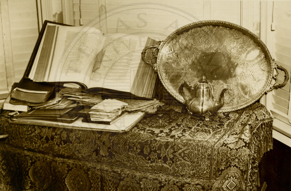 Photo of Bible and plate on display after Roderick More family receives family heirlooms while living in Corpus Christi. Ca1947. b/w. 5 x 7 inches. |
