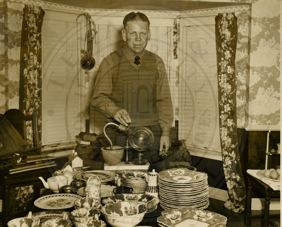 Photo of Roderick More in front of family plates on display after More family receives family heirlooms while living in Corpus Christi. Ca1947. b/w. 5 x 7 inches. |