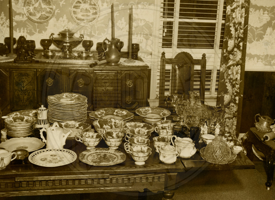 Photo of family china on display after Roderick More family receives family heirlooms while living in Corpus Christi. Ca1947. b/w. 5 x 7 inches. |