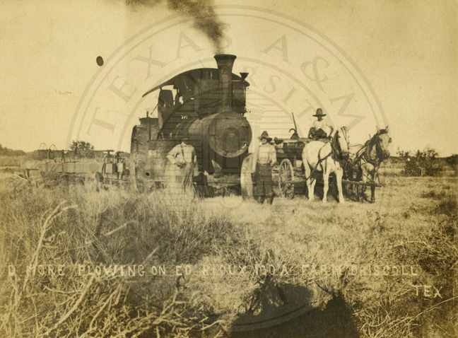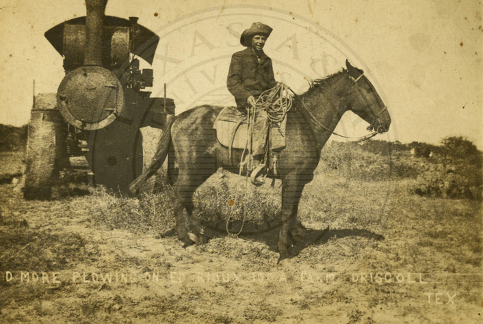 Postcard photo of David More on his horse Dandy in field with steam powered tractor (locomotive) on Ed Rioux farm in Driscoll, TX, 1910. B/w. 3.25 x 5.5 inches |
