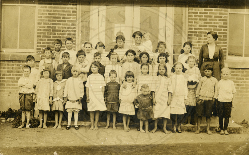 School children standing in front of same school as in #33. Rodrick More is in first row, far right hand side. Post card photo. Ca 1920 B/w. 3.25 x 5.5 inches