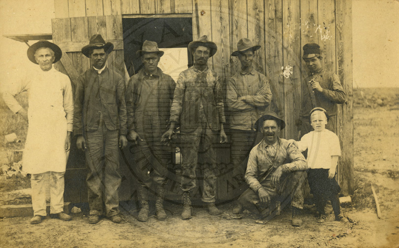 David More standing with group of seven men and one very young boy in camp. In front of a wooden shack. Ca 1904. b/w. postcard. B/w. 3.25 x 5.5 inches