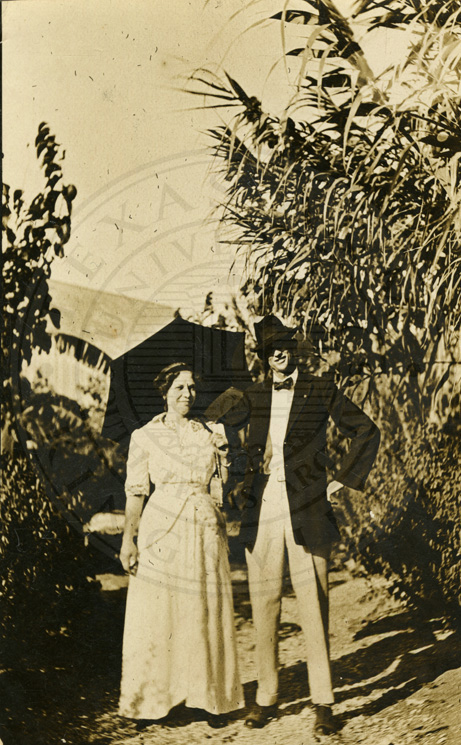 Back of card says “This is a picture I took of my husband and Mrs. Hawley in the Grandi Garden.” B/w. 3.25 x 5.5 inches |