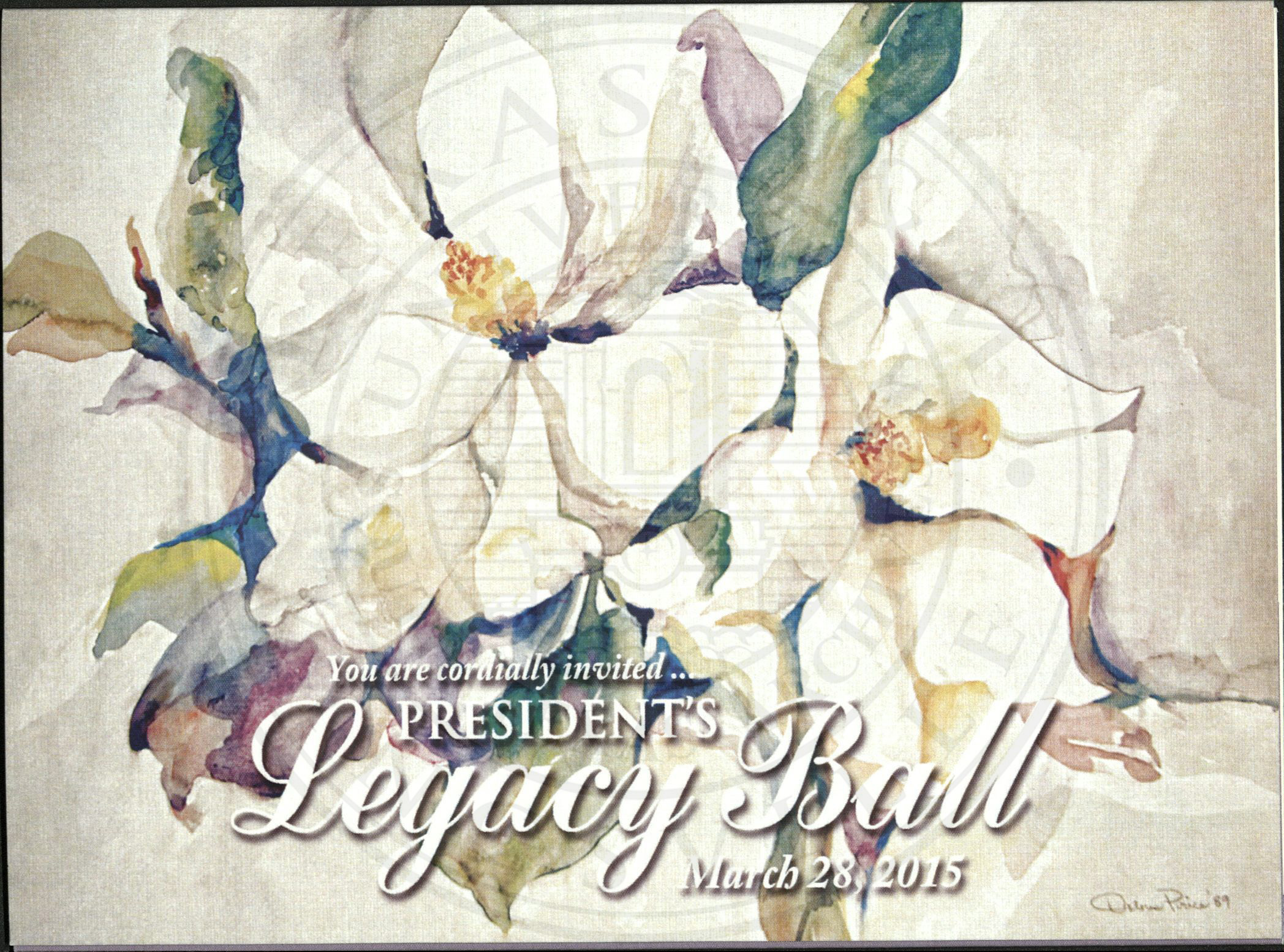 Cover Art for the President's Legacy Ball for Texas A&M University-Kingsville, 2015. Dolores Price painted the water color on the official invitation.