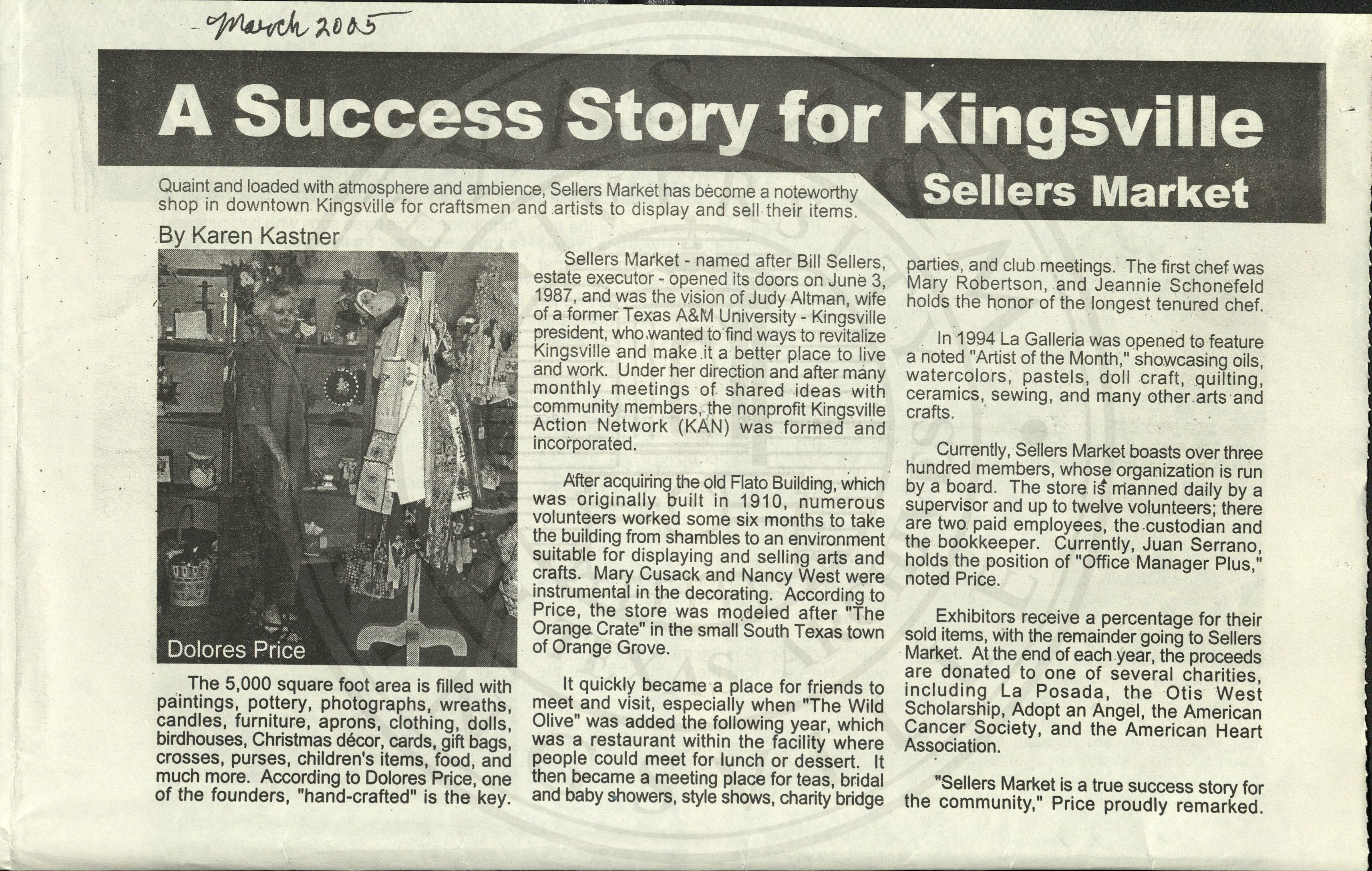 A newspaper article talking about the history of the Sellers Market in Kingsivlle. Opened in 1987 by BIll Seller's used the Flato building to house hand-crafted items to sell. Dolores Price would sell her paintings there. It was open for about 30 years. |