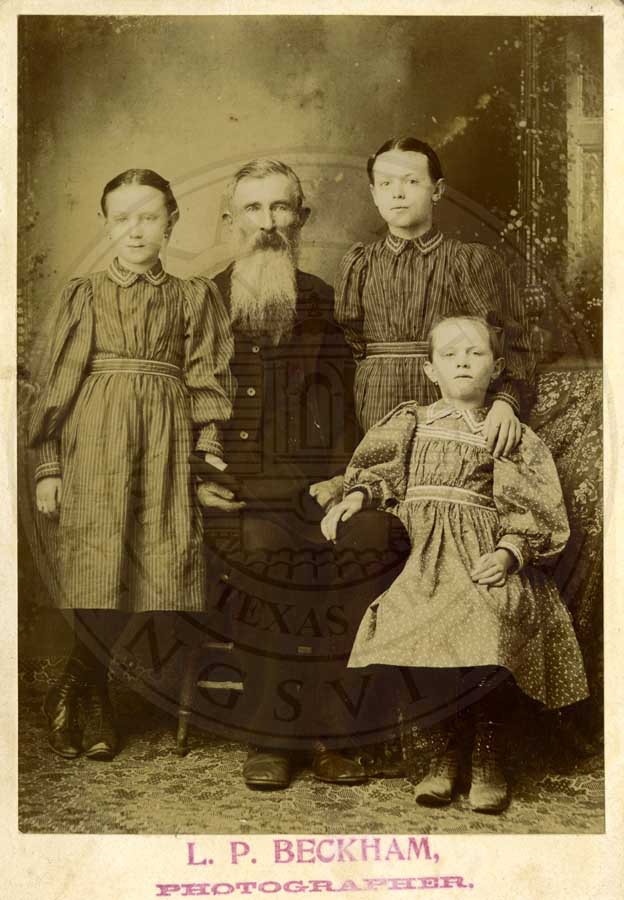 J.M. Exum and his three granddaughters, AnnaBelle, Sallie Lee and Fanny Fern Masterson. He is seated and three girls are standing around him in very posed setting. 1898. L.P. Beckham photographer. b/w. 4.25" x 6.5"