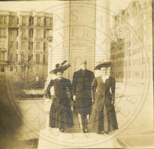 May Hall, a Harvard boy standing between ? and Sallie Lee Masterson in Boston, Mass. 1908. b/w. gelatin emulsion. 3.5" x 3.5"