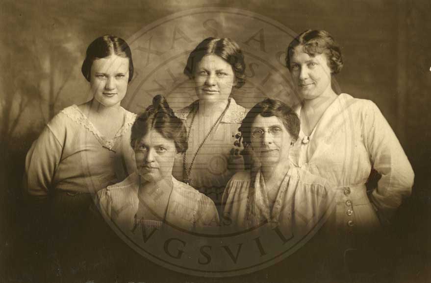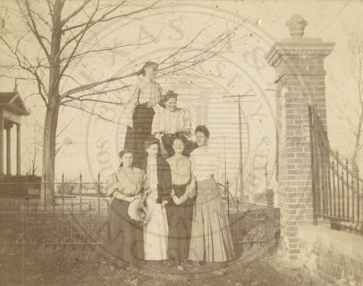 Mary Fain, Sallie Lee Scott, Fanny Fern Heyworth, standing with Ms. Masterson "The Mama" and Anna Bell Kritsen seated in front for portrait. All a part of the Masterson family. n.d. b/w. gelatin emulsion. 4"x6" |
