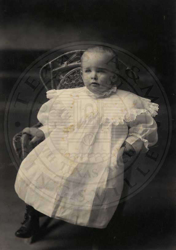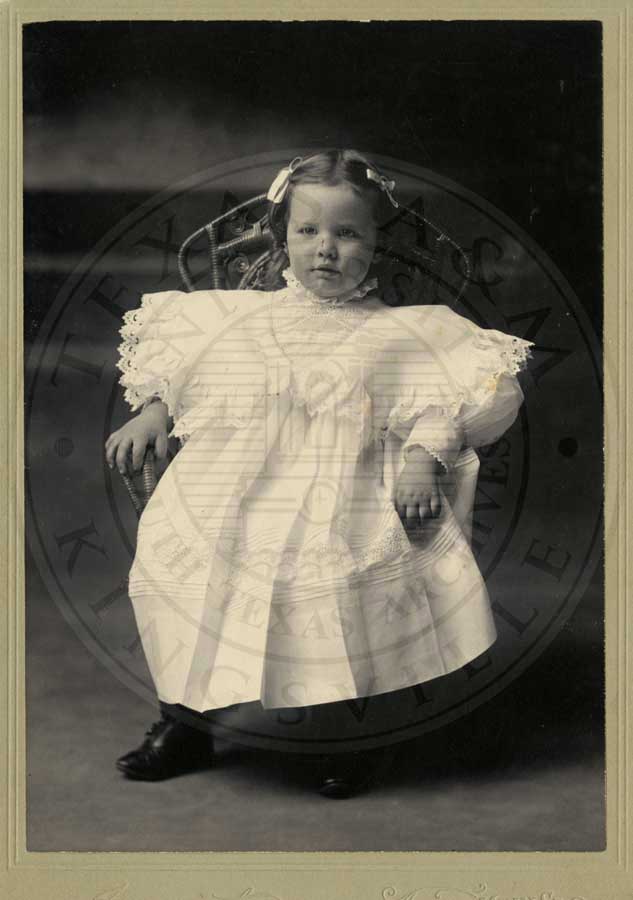 John Malcolme Shelton, Jr. posed seated in small chair in starched white dress. Feb. 4, 1897. b/w gelatin emulsion. photographer: Swarte. 705 Main St. Fort Worth, TX. 4.25" x 6.5"