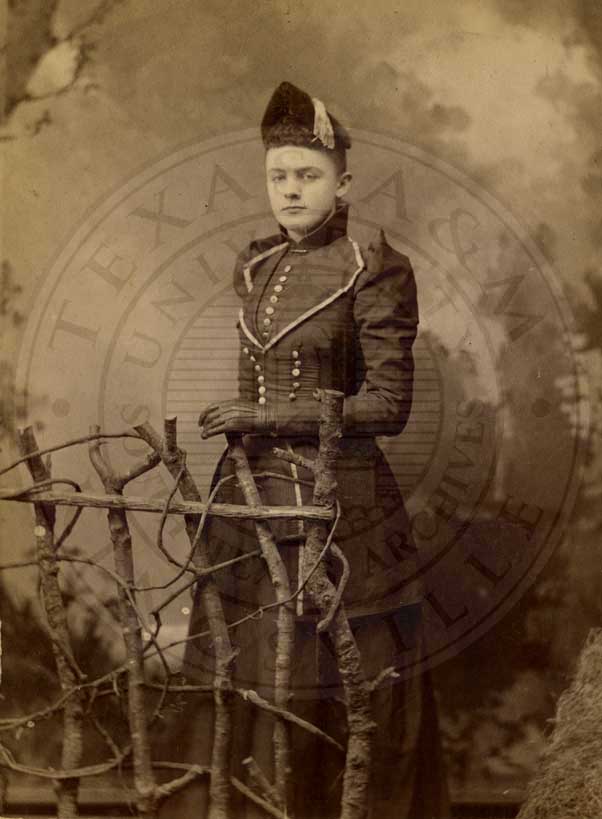 LouElla (Lucy) Exum posed in front of artifical fence wearing what appears to be a uniform. Jan. 7, 1892. inscribed: "To Anna from Lucy [N.T.F. 1e] Sherman, Texas. Jan. 7-92." cabinet photo. albumen emulsion. print done by Caradine, North Side Square, Sherman, Texas. 4.25" x 6.5" |