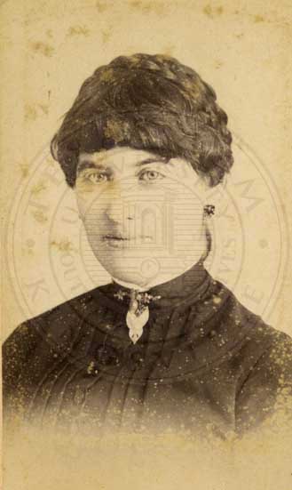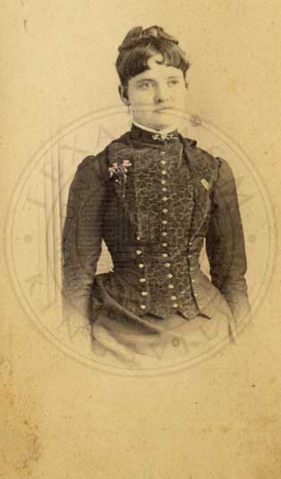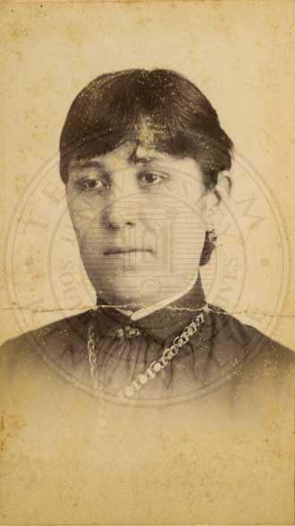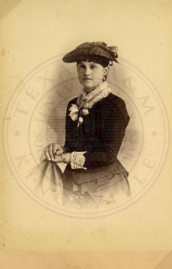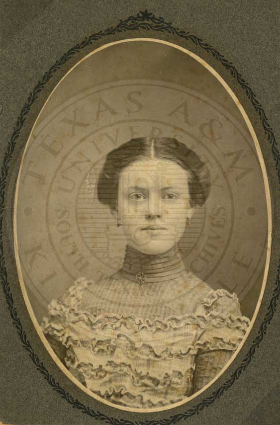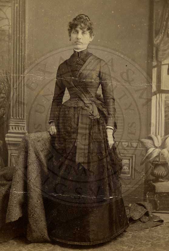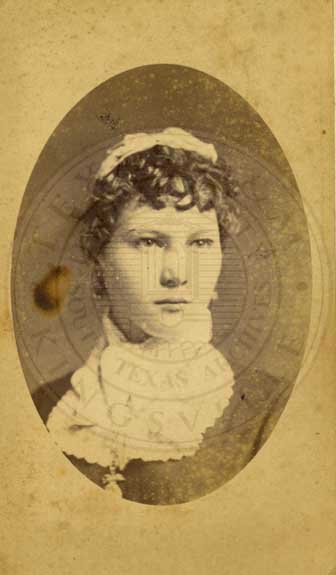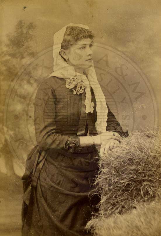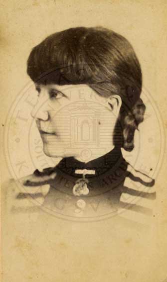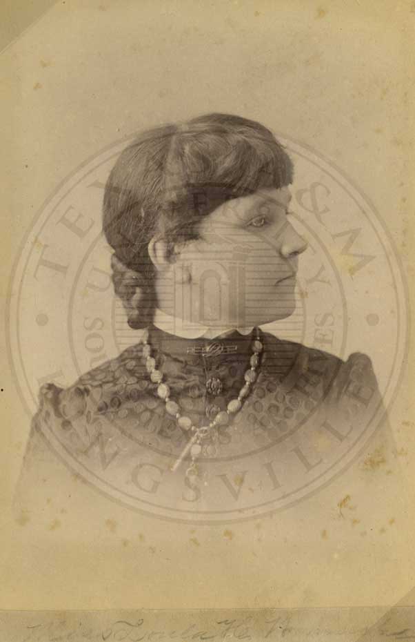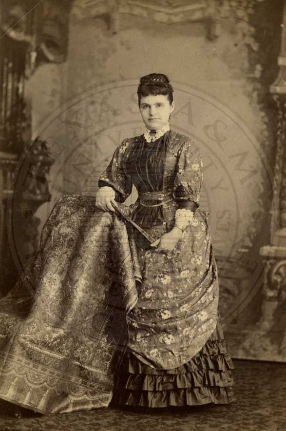 Loula Womack, one of the Big Six at Waco Female College. Portrait. 1883. photo by W.D. Jackson, 423 Austin Ave. Waco, TX. b/w. gelatin emulsion. [some fading and spotting] |