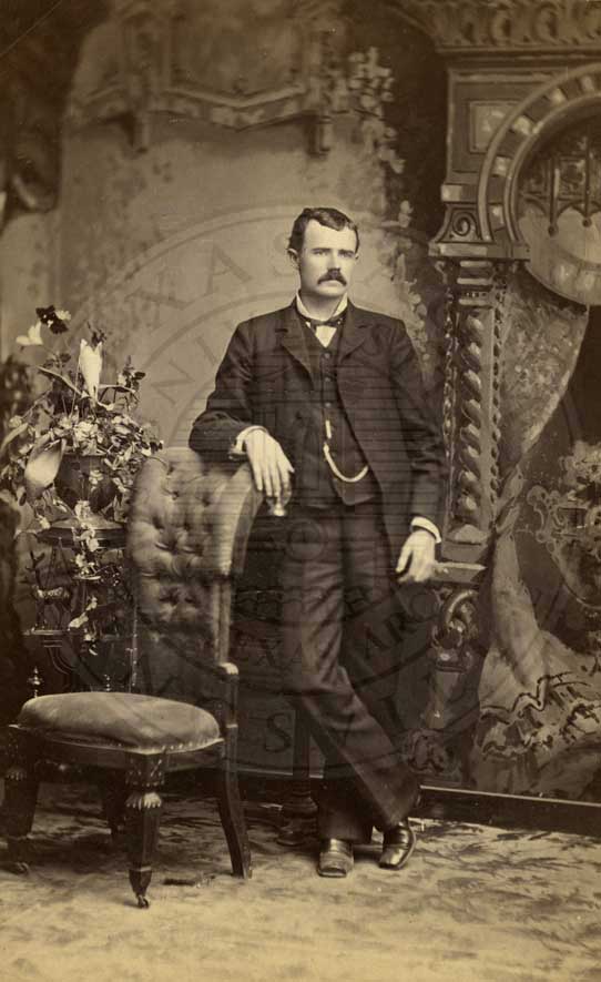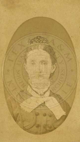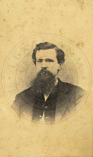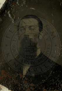 Robert Hamilton. Posed in front of desk with pilars in background and leaning on a pedestal. n.d. Mobectie, Texas. toned & colred print. photographer: 916 Congress Ave., Upstairs, Austin, Texas. Duplicates at reduced rates - old pictures enlarged." Crayen Pastel Water Color." 4.25 x 6.5" [faded] |