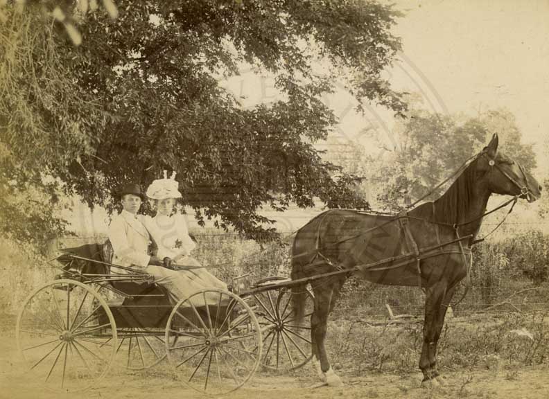 Clint Warmath and his sweethear sitting in horse drawn buggy under a tree. n.d. Inscription: "Clint Warmath and his girl, now his wife." b/w. gelatin emulsion. 4.25 x 6.5