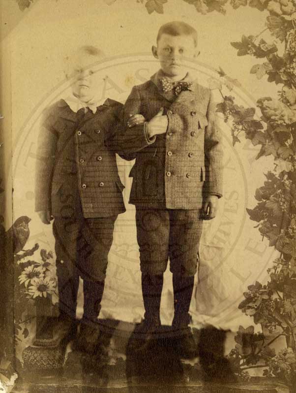 Four (?) and Ben Masterson. Two young boys posed with artifical flowers in background. Boys have linked arms. n.d. b/w. gelatin emulsion. photo by Denver Photo Gallery, J.A. Reall, proprietor. [somespotting] |